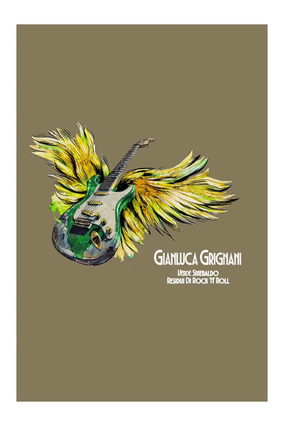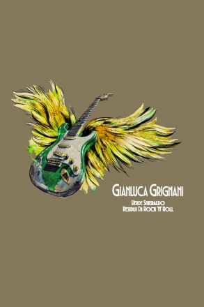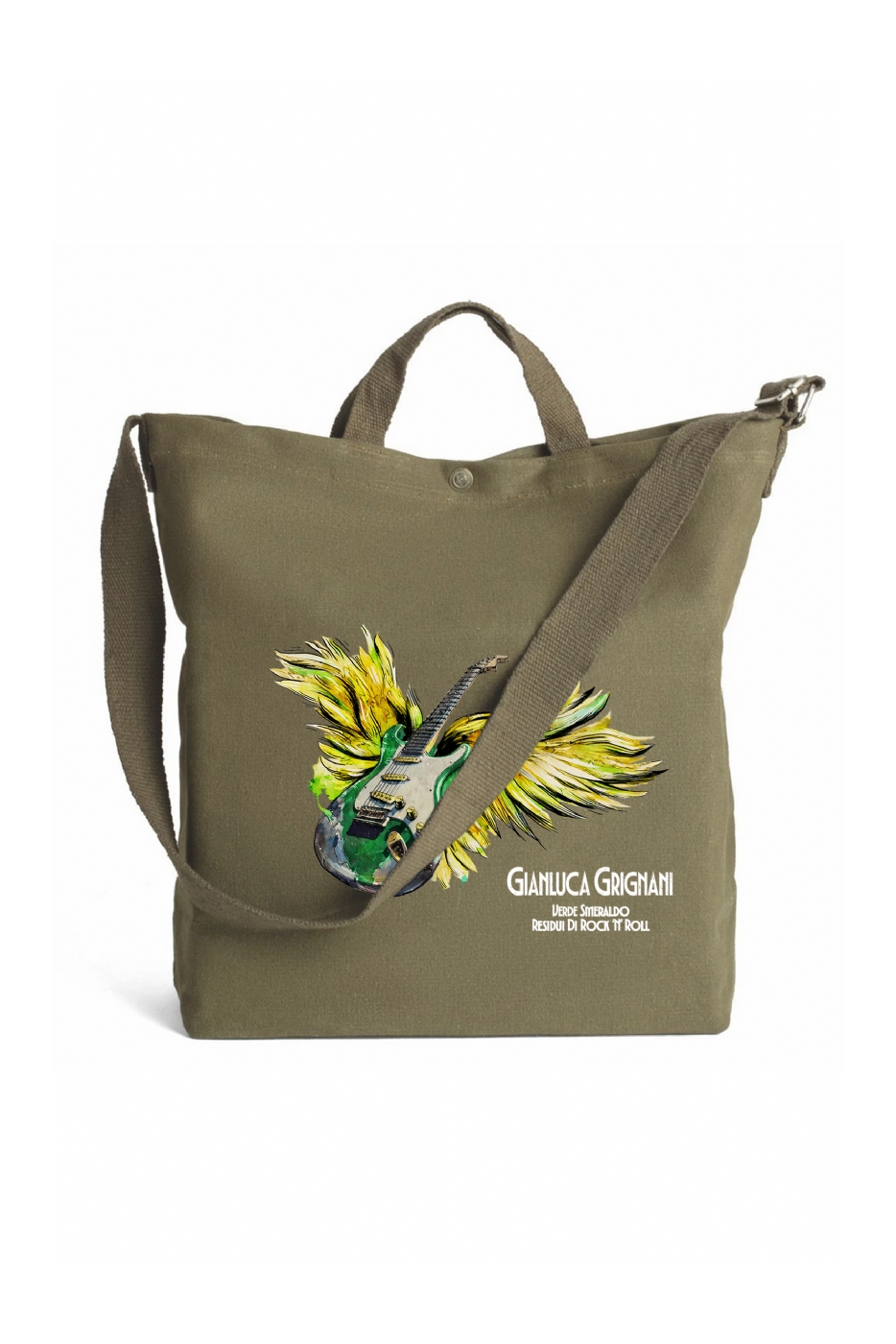 Borsa in canvas 400g/m², doppio manico da 24 cm, tracolla regolabile da 90cm e chiusura con bottone. Tasche interne porta cellulare, tasca interna con zip. Dimensioni: cm 45x37x13 con applicazione Gianluca Grignani Verde Smeraldo Residui di Rock'n'Roll