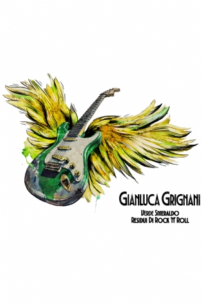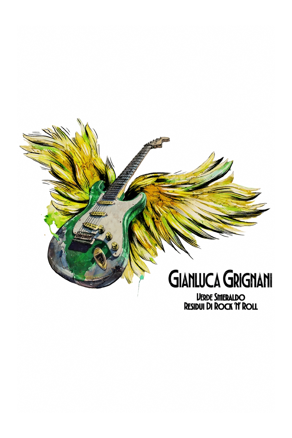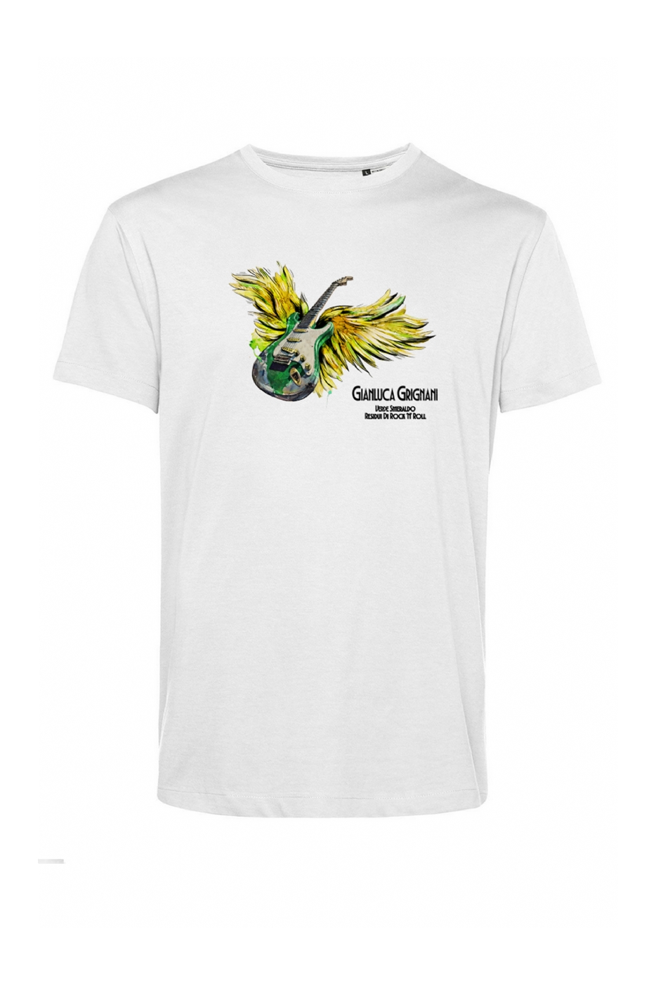T-shirt bianca Stampata fronte Chitarra Ali 100% cotone organico - girocollo con vestibilità classica, sensazione morbida al tatto per un comfort fenomenale. Superficie liscia e jersey ad alta densità.