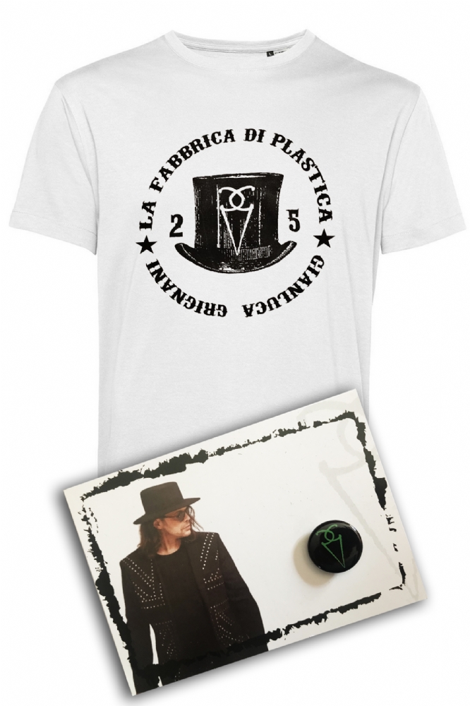 T-shirt bianca La Fabbrica di Plastica+cartolina e pins